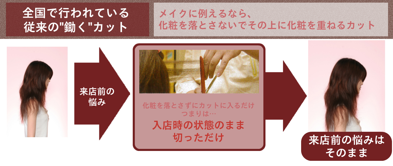 また、毛量を減らすことで髪の風通しを良くし、頭を蒸れにくくすると同時にクセ毛を改善し、髪を無地のキャンパス状態に戻すことで今までお客様が挑戦できなかった、希望のパーマやヘアスタイルもできるようになります。