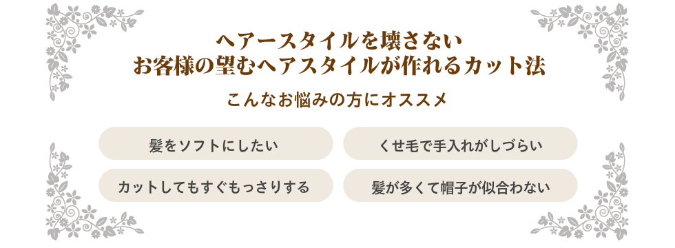 髪の密度を一定にすることで、手入れがしやすく、カットの持ちが良い、そしてサロンで創ったスタイルが自宅で簡単に再現しやすい髪に整えます。